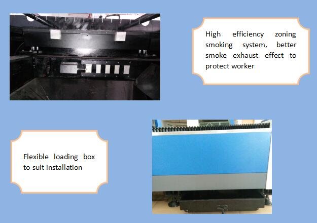3. Vysoce účinný systém územního kouření na obou stranách těla stroje, Silný segmentovaný prach a sběr kouření, sníží poškození pracovníků.